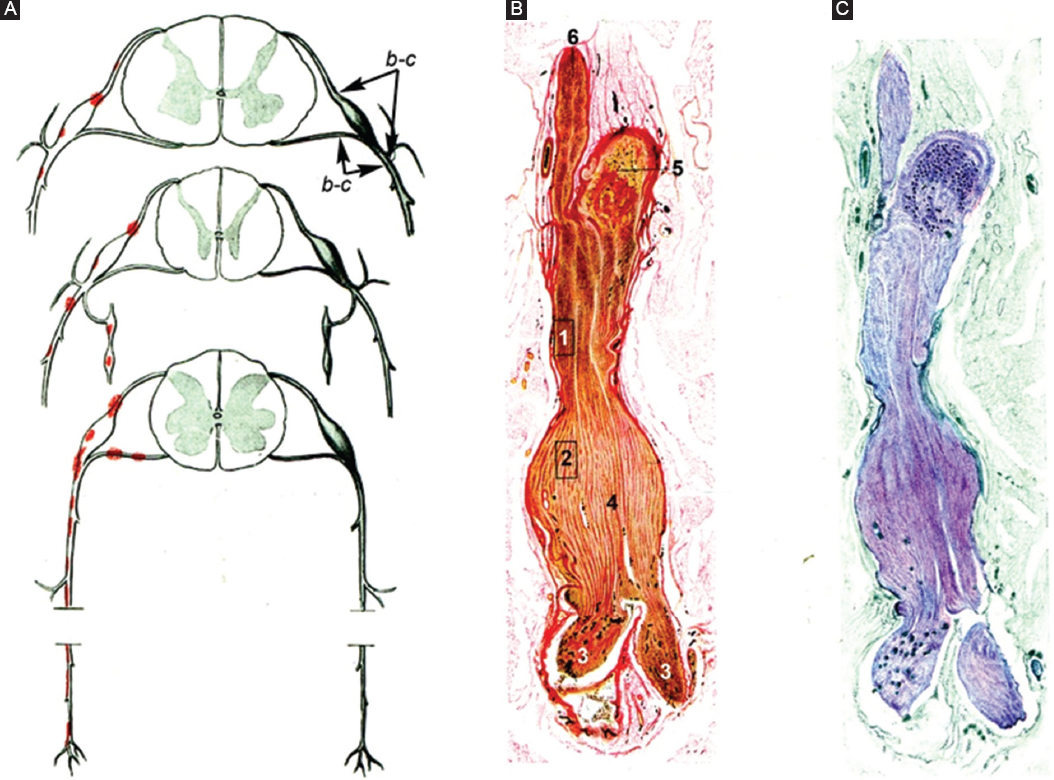 Figure 1. Reproductions of Figs. 65-67 by Krücke6 with minimal modifications. A: diagram of GBS lesions at cervical (upper row), thoracic (middle row), and sacral (lower row) levels; note that they mainly rely on proximal nerves including ventral and dorsal spinal roots, spinal root ganglia, sympathetic ganglia, and ventral rami of spinal nerves (red dots). Lettering b-c indicates nerve segment illustrated in other figures reported by Krücke. B: longitudinal section of the nerve segment between ventral spinal root and spinal nerve from a GBS patient who died on day 18, original numbering being as follows: (1 and 2) areas illustrated by the author in other figures (specially his Fig. 68b showing abundant endoneurial inflammatory edema, which was designated as “mucoid exudate”); (3) rami of the spinal nerve (undoubtedly, ventral, and dorsal rami); (4) spindle-shaped swelling of the spinal nerve; (5) spinal root ganglion; and (6) ventral spinal root (Van Gieson, magnification not specified). C: the same longitudinal section showing a purplish discoloration of the spindle-shaped swelling of the spinal nerve (Cresyl violet, magnification not specified). GBS: Guillain-Barré syndrome.