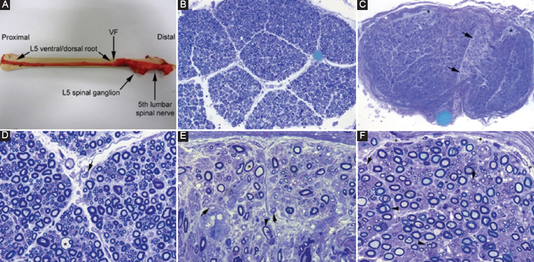 Figure 2. Pathological features from a severe acute inflammatory demyelinating polyneuropathy who died on 9th day after onset. A: after being dissected down, macroscopic appearance of the right L5 spinal root, L5 spinal ganglion and fifth lumbar spinal nerve. Whereas the pre-foraminal root shows normal morphology, as of the VF note visible nerve enlargement. B: semithin cross-section of L5 ventral root, taken 1 cm above its entrance to the VF, showing that the density of myelinated fibers is preserved (Toluidine blue; original magnification ×100 before reduction). C: semithin cross-section of the ventral ramus of the fifth lumbar nerve, taken at its emergence trough intervertebral foramen, showing widespread endoneurial edema, which is more conspicuous in septum adjacent areas (arrows) and sub-perineurial areas (asterisks); such edema results in a spacing out phenomenon giving an observer the false impression of reduced density of myelinated fibers (Toluidine blue; original magnification ×65 before reduction). D: high-power view of the L5 ventral root showing preservation of the density of myelinated fibers with occasional presence of mononuclear cells (arrow) and a fiber exhibiting myelin vacuolization (asterisk). E: high-power view of the sub-septum area arrowed in C. Note the presence of florid inflammatory edema with numerous mononuclear cells (arrows), fibers with inappropriately thin myelin sheaths (asterisk), and fibers exhibiting myelin vacuolation (arrowhead). Having in mind the spacing out phenomenon, note the false impression of reduced density of myelin fibers in comparison with L5 ventral root and sciatic nerve (Toluidine blue; original magnification ×630 before reduction). F: semithin section of sciatic nerve showing occasional demyelinated axons (arrows), fibers with vacuolar degeneration (arrowheads), and widespread but discreet endoneurial edema more marked in sub-perineurial areas (asterisks) with presence of mononuclear cells (arrows) (Toluidine blue; original magnification ×630 before reduction). VF: vertebral foramen. Adapted from Gallardo et al.14.