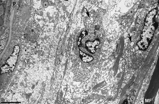 Figure 3. Electron micrograph of a subperineurial area of the fifth lumbar nerve (same the patient illustrated in Fig. 2) showing extensive edema on a ground substance of amorphous material, most likely proteoglycans, with sparse bundles of collagen fibrils. Note the presence of macrophages containing lipid droplets (asterisks) and numerous electron-lucent endocytic vesicles (arrows) and lysosomes. The edematous area is empty of myelinated fibers, the only one observed (MF) being separated about 20 mm from the inner perineurial layer; P indicates perineurium (Bar, 3 mm). Taken from Gallardo et al.14.