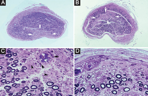 Figure 4. Ischemic nerve lesions in acute inflammatory demyelinating polyneuropathy. A: semithin cross-section of the ventral ramus of the third lumbar nerve showing a wedge-shaped area (arrows) with marked loss of myelinated fibers (Toluidine blue; ×62 before reduction). B: semithin cross-section of the lumbosacral trunk with a centrofascicular area (arrows) also exhibiting marked loss of myelinated fibers (Toluidine blue; ×62 before reduction). Both in A and B note apparent widespread diminution of myelinated fibers. C: this high-power view of the central region of the lumbosacral trunk illustrates interstitial edema, severe reduction of large myelinated fibers, thinly myelinated small axons, preserved unmyelinated axons (arrowheads), and widespread endoneurial mononuclear inflammatory cells, some of them with perivascular distribution (arrows) (Toluidine blue; ×375 before reduction). D: this high-power view of the subperineurial region of the lumbosacral trunk shows numerous de-remyelinated fibers, edema, and mononuclear cells; such extensive demyelination accounts, to some degree, for the apparent widespread loss of myelinated fibers observed in image B (Toluidine blue; ×475 before reduction). Adapted from Berciano et al.25.