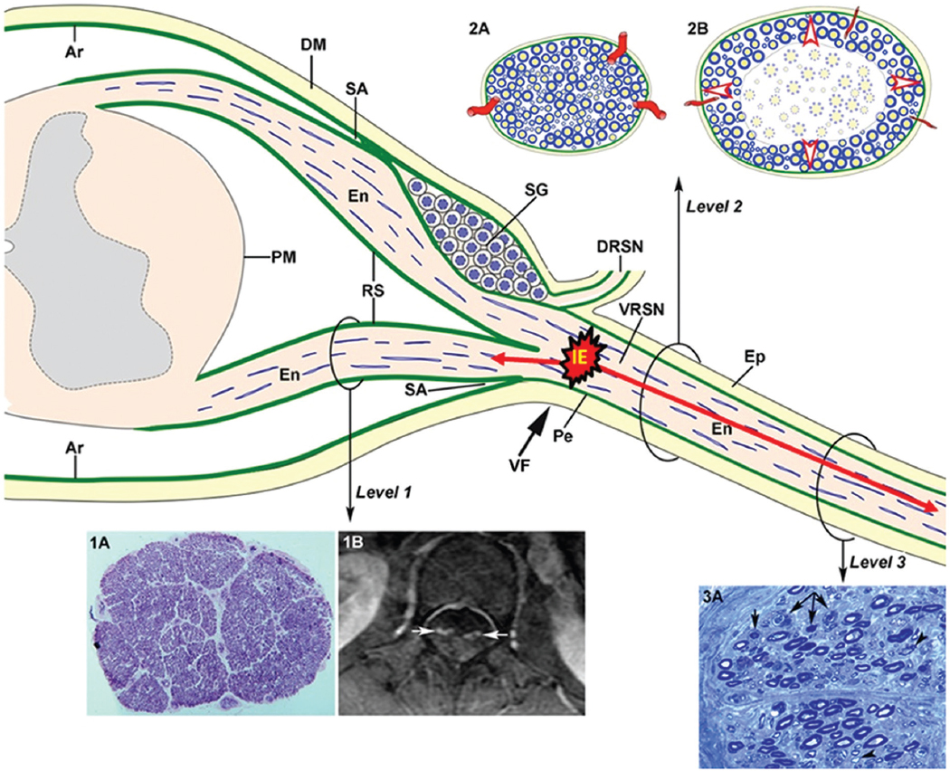Figure 5. Diagram of spinal root and spinal nerve microscopic anatomy illustrating the topography of early GBS lesions and their consequences. As of subarachnoid angle (SA), the epineurium (Ep) is in continuity with the dura mater (DM). The endoneurium (En) persists from the peripheral nerves through the spinal roots to their junction with the spinal cord. At the SA, the greater portion of the perineurium (Pe) passes between the dura and the arachnoid (Ar), but a few layers appear to continue over the roots as the inner layer of the root sheath (RS). The arachnoid is reflected over the roots at the SA and becomes continuous with the external layers of the RS. At the junction with the spinal cord, the outer layers become continuous with the pia mater (PM). Immediately beyond the spinal ganglion (SG), at the SA, the ventral and dorsal nerve roots unite to form the spinal nerve, which emerges through the intervertebral foramen (VF; large black arrow) and divides into a dorsal ramus (DRSN) and a ventral ramus (VRSN). Therefore intrathecal nerve roots are covered by an elastic root sheath derived from the arachnoid, whereas spinal nerves possess epi-perineurium which is relatively inelastic. Proximal-to-distal early GBS inflammatory lesions are illustrated as follows: ventral lumbar root (level 1), spinal nerve (level 2), and sciatic nerve (level 3). At level 1, this semithin complete cross section of ventral L5 root shows preservation of the density myelinated fibers (1A), though inflammatory lesions, observable at higher augmentation (not shown), may account for increased surface area, and thickening and contrast enhancement of ventral roots on spinal magnetic resonance imaging (1B, white arrows). Both cartoons at level 2 illustrate the following features: (i) normal anatomy of spinal nerve, usually monofascicular with epi-perineurial covering (2A), which account for its sonographic appearance usually consisting of a hypoechoic oval structure surrounded by hyperechoic perineurial rim; and (ii) endoneurial inflammatory edema may cause a critical elevation in EFP that constricts transperineurial vessels by stretching the perineurium beyond the compliance limits (2B, arrowheads), which could result in areas of endoneurial ischemia, here centrofascicular. As illustrated herein (2A vs. 2B), despite low spinal nerve compliance, early inflammatory events in GBS may cause an increase of cross sectional area. Inflammatory edema (IE) may cause anterograde (centrifugally) axonal degeneration (longer red arrow) and retrograde axonal degeneration (short red arrow), which at earliest stages of the disease predominates in the distal segment of the anterior spinal root, as originally reported in AMAN30 and AMSAN31,32. At level 3, this cross semithin section of sciatic nerve from a fatal acute inflammatory demyelinating polyneuropathy patient shows several myelinated fibers exhibiting Wallerian-like degeneration (myelin collapse, small black arrows) secondary to more proximal inflammatory lesions; note the presence of remyelinated fibers (arrowheads) and lipid-laden macrophages. Without knowledge of proximal nerve pathology, such distal florid Wallerian-like lesions would make it very difficult to reach an accurate diagnosis. this diagram was inspired by Figs. 36 from Berthold et al.28. GBS: Guillain-Barré syndrome. Adapted from Berciano1214.