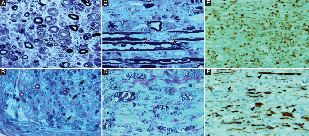 Figure 6. Pathology in fulminant Guillain-Barré syndrome with very early universal nerve inexcitability (see text); autopsy was performed on day 18. A: semithin cross section of L5 ventral root showing massive demyelination and numerous lipid-laden macrophages and endoneurial edema (Toluidine blue; ×630 before reduction). B: semithin cross section of femoral nerve illustrating marked axonal degeneration (asterisks). Note the presence of denuded axons (arrows) and endoneurial and subperineurial inflammatory edema (Toluidine blue, ×630 before reduction). C: longitudinal semithin section of L5 ventral illustrating paranodal (arrowheads), denuded axons (asterisks) and lipid laden macrophages (Toluidine blue ×630 before reduction). D: longitudinal semithin section of femoral nerve showing that normal texture has been substituted by digestion chambers intermingled with collagen bundles, which are indicative of extensive Wallerian-like degeneration (Toluidine ×630 before reduction). E: paraffin-embedded longitudinal section of ventral spinal root showing diffuse macrophage infiltration (CD68 ×120 before reduction). F: paraffin-embedded longitudinal section of ventral spinal root showing that neurofilaments are relatively preserved, although some of them exhibit dystrophic features (arrowheads) probably due to loss of their myelin envelop (Neurofilament ×240 before reduction). Adapted from Berciano et al.35.