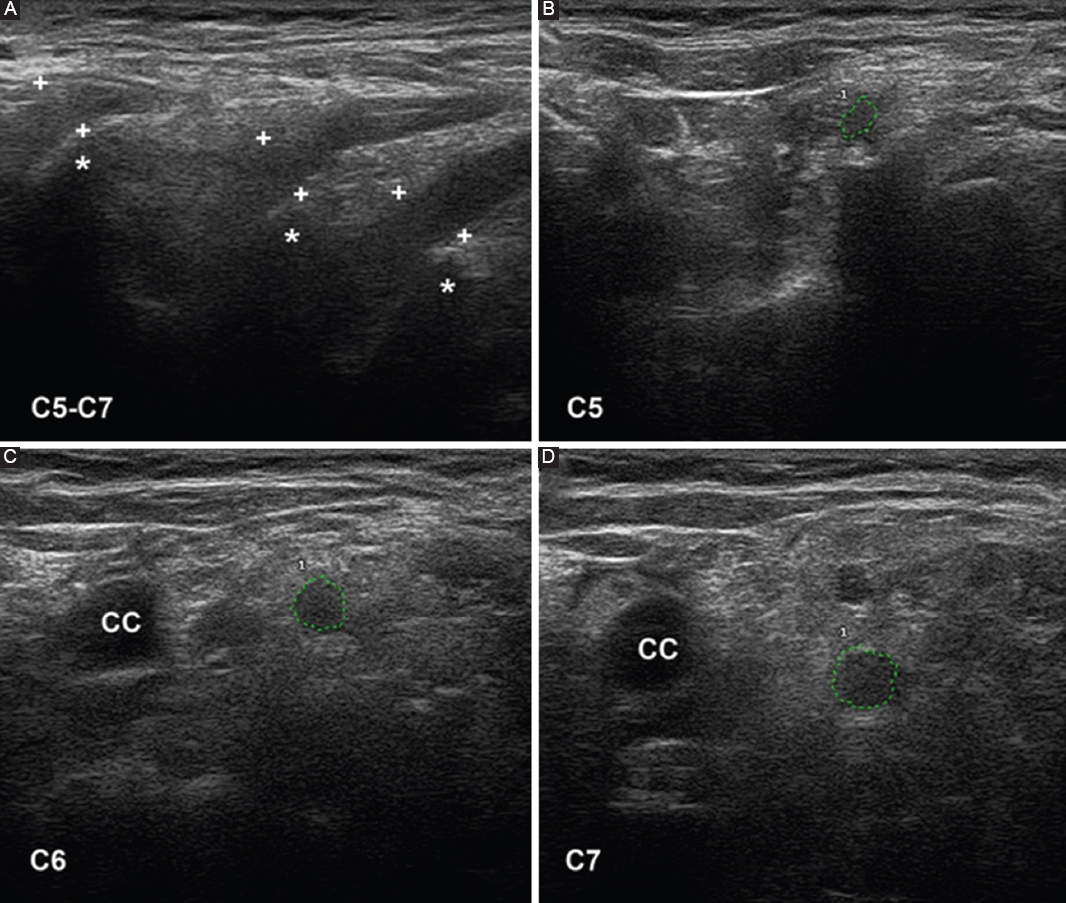 Figure 7. Ultrasound study of the ventral rami of nerves C5-C7, obtained on the 5th day of progression in a patient with fulminant acute inflammatory demyelinating polyneuropathy (same patient as in figures 2 and 3). A: sagittal images showing disappearance of the epineurial hyperechoic rims (crosses indicate calipers; asterisks indicate the transverse processes). B-D: short-axis ultrasound of the three cervical nerves, whose perimeters are marked with green dotted lines; their cross-sectional areas are abnormally large. Note the disappearance of the epineurial rims. CC: common carotid artery. Taken from Gallardo et al.14.