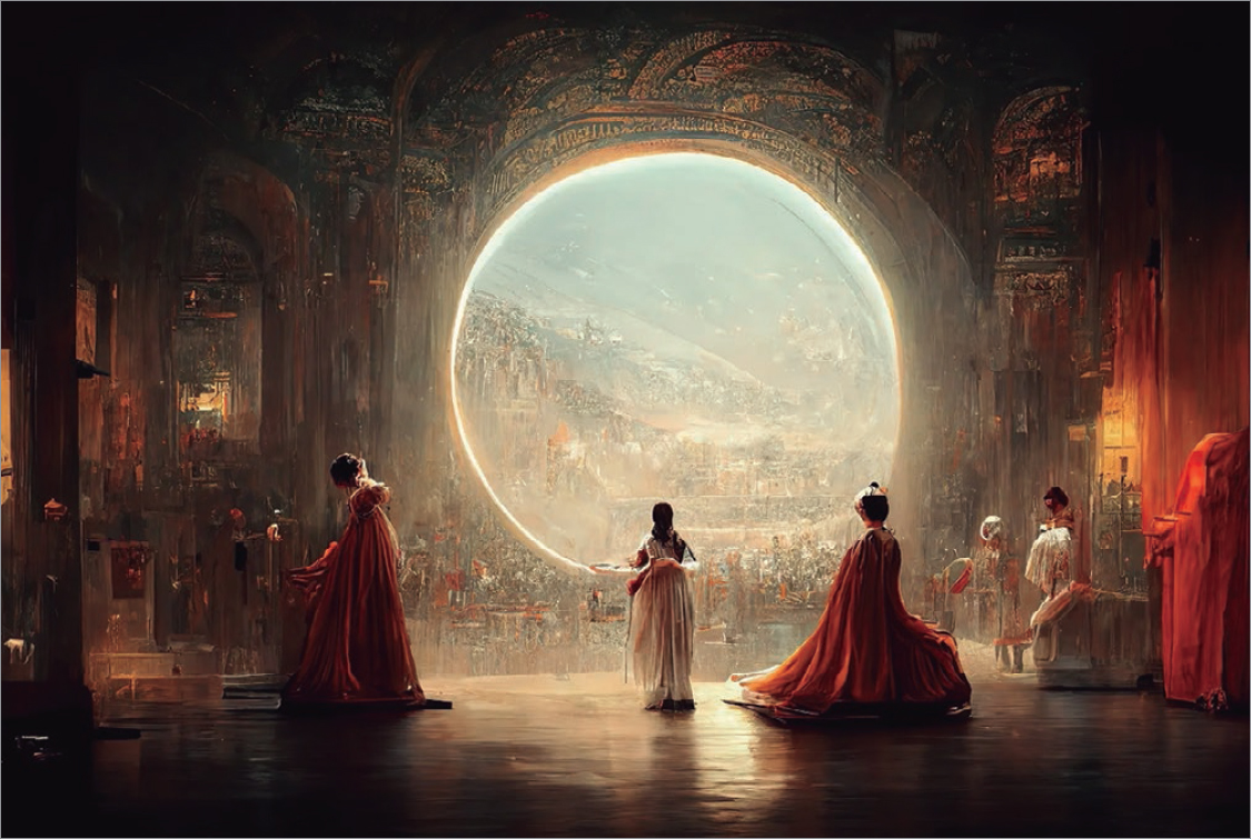 FIGURA 1. Théâtre d’opera spatial, obra de Jason Allen de 2022 creada con el programa Midjourney y ganadora de un prestigioso concurso en 2022. Muestra un elaborado uso de luces y sombras y de colores junto a atuendos de distintas épocas, un paisaje natural y decorados variados. Estos suman rasgos barrocos en palcos y espacios del fondo del escenario, y una prominente ventana circular en moderno ojo de buey ocupa el centro del lienzo y actúa como umbral entre lo externo, natural, y lo interno, cultural (imagen de libre acceso en: https://upload.wikimedia.org/wikipedia/commons/b/b2/Théâtre_d’Opéra_Spatial.webp).