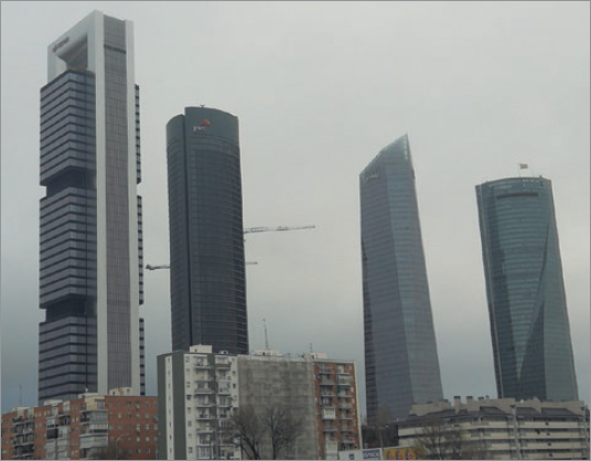 FIGURA 2. Imagen de las torres del Paseo de la Castellana de Madrid en las primeras horas de una mañana de invierno con niebla. Se aprecia el fondo blanco sobre el que emergen las torres, que así resaltan y adquieren volumen y notoriedad, reforzada por su color negro. El tenebrismo que inventara Caravaggio es este mismo efecto visual, aunque aquí el fondo será habitualmente oscuro y de él emergerán elementos claros (en el caso típico, blancos), con el mismo efecto impactante propio del contraste claroscuro. Es un buen ejemplo de la saliencia como requisito del arte. Parece lógico preguntarse si la invención artística de Caravaggio no sería el resultado de observar Roma o Florencia sobre el fondo de nieblas invernales (fotografía del autor).