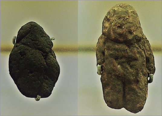 FIGURA 3. Imagen de la Venus de Berekhat Ram (izquierda). Fue hallada en 1981 en los altos del Golán por la arqueóloga Naama Goren-Inbar, de la Universidad hebrea de Jerusalén. Por la datación (entre 300.000-400.000 años) se atribuye a Homo erectus, que la habría elaborado con sucesivas incisiones bajo la cabeza y raíz de brazos. Hay expertos que han cuestionado la intencionalidad representativa de esta figura. A la derecha, la Venus de Tan Tan, hallazgo del arqueólogo de la Universidad de Hesse Lutz Fiedler en las orillas del río Draa, cercano a la localidad marroquí de Tan Tan. Contemporánea pero más estilizada que la anterior, se ha discutido si es obra de Homo erectus o un artefacto geológico natural («geofacto») (ambas imágenes son fotografías autorizadas de réplicas del Museo de la Evolución de Burgos).
