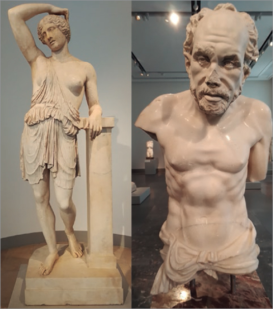 FIGURA 4. A la izquierda, Amazona herida, obra de Policletos de Argos, 430 a.C. Es un modelo idealizado copiado después con profusión. Muestra la simetría, proporciones y armonía de formas propias de la belleza ideal de la Grecia clásica. A la derecha, Torso de un viejo pescador, copia de un original del 200 a.C. Se trata de un ejemplo de escultura helenística, más tardía que la clásica. Ambas representan figuras reales que revelan la fragilidad corporal de la gente corriente. Dieciocho siglos después, el Barroco explotaría este mismo fenómeno (fotografías del autor del Altes Museum de Berlín).