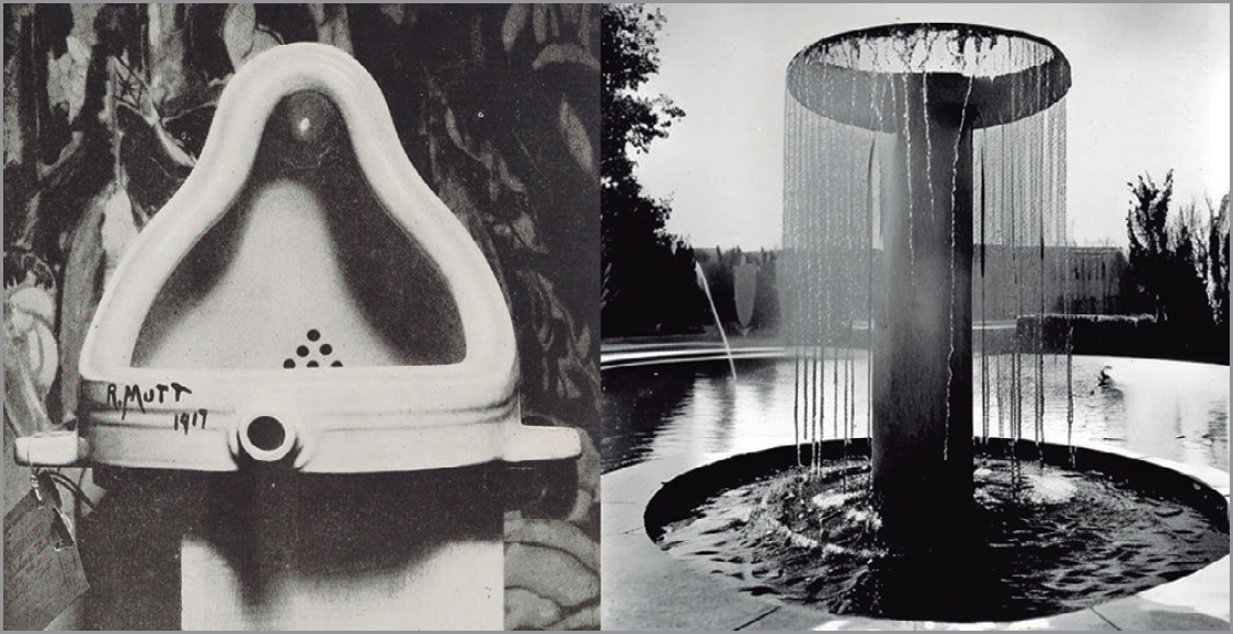 FIGURA 5. A la izquierda, imagen de la obra dadaísta Fountaine, de Marcel Duchamp, en una fotografía de 1917 de Alfred Stiglitz (dominio público: Wikipedia.org). La escultura fue un gesto de rebeldía y exaltación de lo irracional e intuitivo frente a los monstruos de la razón de la Guerra Mundial que por entonces transcurría. A la derecha, imagen creada para el autor de este artículo por el programa Creative Art con el prompt: Fountaine + Marcel Duchamp. La perfección de la geometría circular, del movimiento congelado del agua o de los juegos de luces y sombras en el matizado blanco y negro imantan al espectador y superan a los del arte humano. Para desenmascararlo y llevarlo a su estatus auténtico ese espectador debería preguntarse: ¿a qué remite?