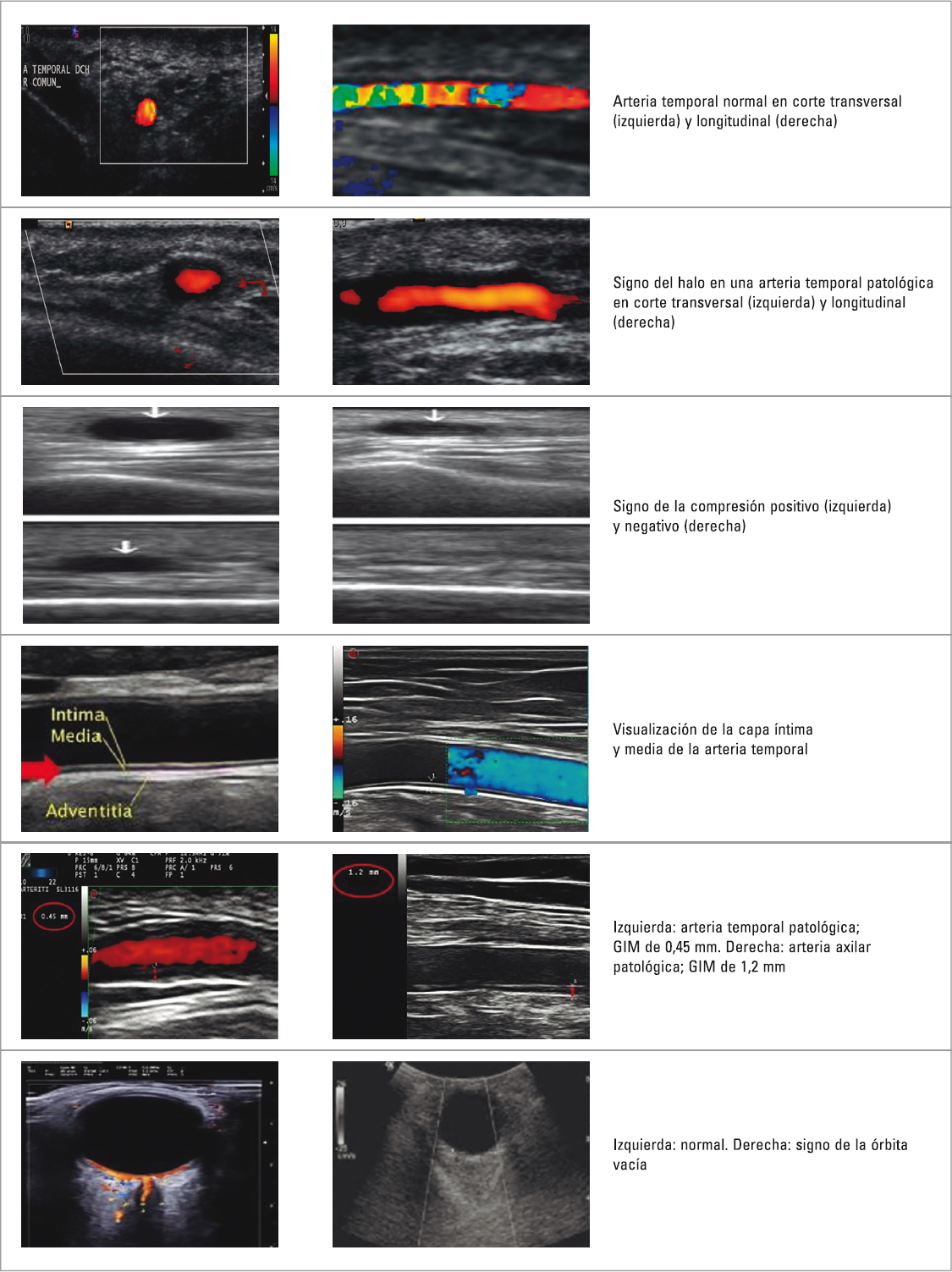 • Grosor íntima-media (GIM): si existe signo del halo y se confirma el diagnóstico, se puede determinar el GIM de la arteria con los signos vasculíticos para el seguimiento. Esta determinación incrementa la sensibilidad y especificidad. Solo sería valorable el GIM para el seguimiento en la arteria con signo de halo al diagnóstico y siempre que se excluya que haya placas ateromatosas a ese nivel. Los puntos de corte son los siguientes: arteria temporal ≥ 0,34 mm; gran vaso ≥ 1 mm.