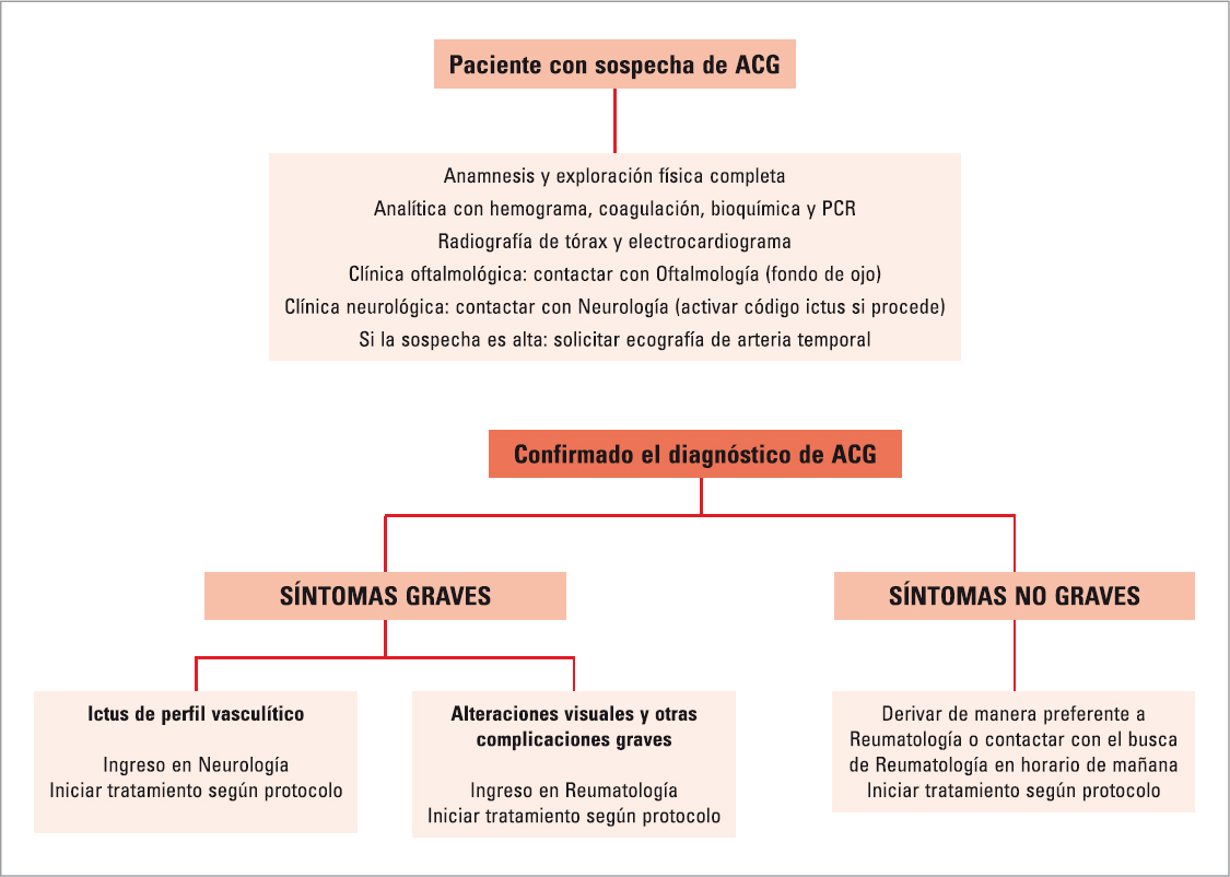 Se ha tomado como referencia el abordaje diagnóstico y terapéutico elaborados por el American College of Rheumatology (ACR) (https://rheumatology.org/vasculitis-guideline). Se han considerado también los protocolos publicados sobre ACG por la European Alliance of Associations for Rheumatology (EULAR) (https://www.eular.org/recommendations-management).