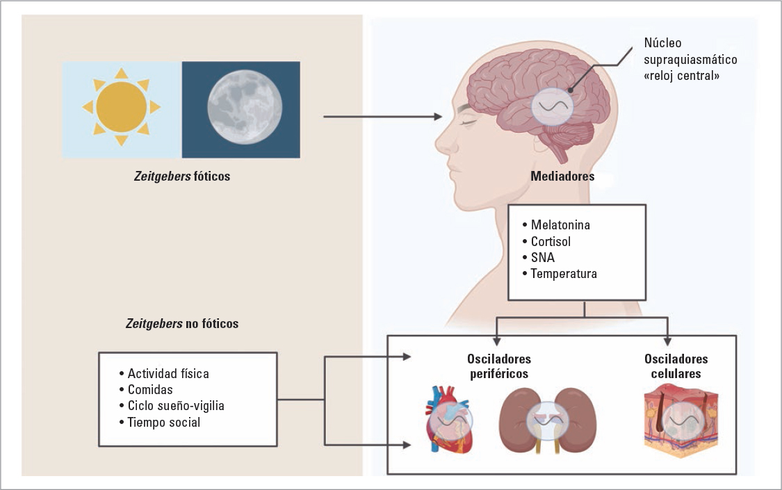 Este sistema molecular, responsable del ciclo interno en cada célula, se ve coordinado por el marcapasos central localizado en el NSQ. Este núcleo recibe las aferencias de diferentes «dadores de tiempo» (zeitgebers por su nombre en alemán), que permiten coordinar el ritmo interno con las señales externas. Algunos de los zeitgebers conocidos son la alimentación o el ejercicio físico, aunque el principal sincronizador es la luz. Esta es captada por las células ganglionares retinianas, que estimulan las neuronas del NSQ. Las neuronas del núcleo frenan durante el día la secreción de melatonina por la glándula pineal mediante la activación del sistema simpático. Solo es durante la noche que, al cesar el impulso luminoso, la melatonina es liberada, actuando sobre los tejidos periféricos y consiguiendo de este modo regular cada uno de los relojes internos celulares al ritmo externo. En este proceso, el NSQ actúa como director de orquesta, donde los tejidos periféricos ejercen de ejecutores. Sin embargo, la melatonina no es la única sustancia mediadora, sino que también ejercen este control otras moléculas como el cortisol o los cambios en la temperatura corporal regulados por el hipotálamo.