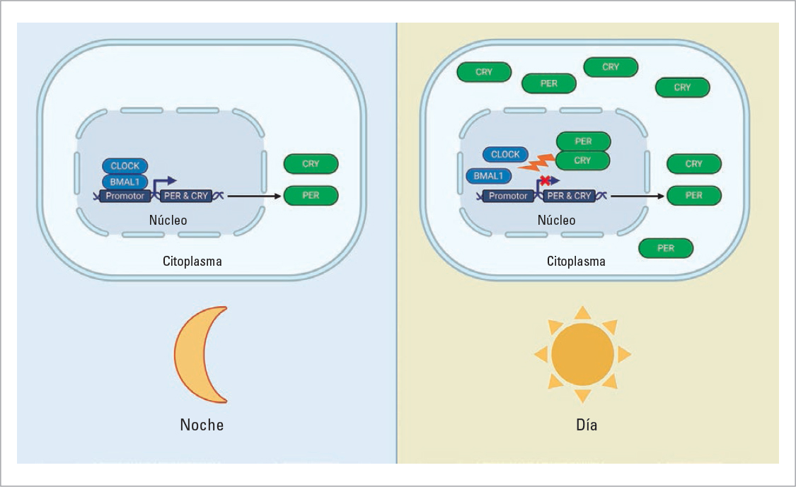 FIGURA 2. Regulación del reloj molecular. Durante la noche existe una expresión incrementada de PER y CRY inducida por los genes CLOCK y BMAL1. En el día, el exceso de las proteínas CRY y PER impide la unión de BMAL y CLOCK a las regiones promotoras, inhibiendo la síntesis de PER y CRY.