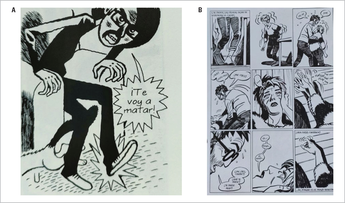 FIGURA 1. A: en esta viñeta de Epiléptico (Editorial Sinsentido, actualmente Salamandra Graphic, de Penguin Random House) se puede apreciar la presencia de una emanata bajo el pie del personaje que sugiere violencia, golpe y ruido; también se ve cómo el bocadillo que contiene el texto colabora en la comunicación (aquí está muy lejos de los habituales contornos redondeados) expresando enfado y agresividad. B: esta página de Oleg (Astiberri Ediciones) permite ver varias líneas de acción o emanatas que indican desde debilidad a desplazamiento; en una de ellas se intuye un movimiento repetido de un brazo, probablemente una crisis focal motora (con permiso).