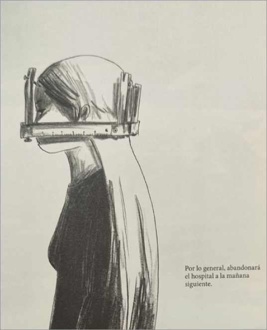 FIGURA 2. La protagonista de El paréntesis (Editorial Sinsentido, actualmente publicado por Editorial Andana) con un marco de estereotaxia. Ejemplo de ilustración muy cercana a la realidad que puede ser utilizada con fines divulgativos (con permiso).
