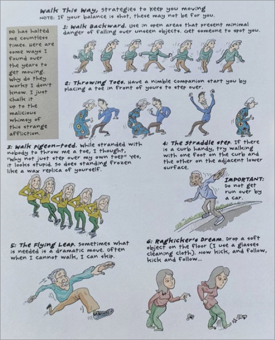 FIGURA 3. My degeneration (The Pennsylvania State University Press). Página donde el autor ilustra sus estrategias para vencer los bloqueos debidos a la enfermedad de Parkinson (con permiso).
