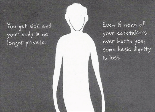 FIGURA 4. Tangles (Calgary: Freehand). Con esta sencilla ilustración la autora nos habla de la pérdida de privacidad del cuerpo de los pacientes dependientes (con permiso).