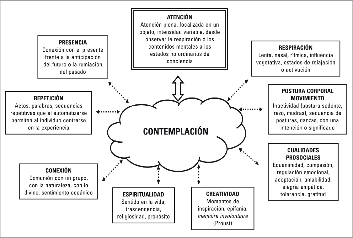 Las prácticas contemplativas promueven la serenidad mental, cultivan la conciencia (también la autorregulación y la indagación), modulan la atención, la presencia y la regulación emocional, y frecuentemente buscan conectar al individuo con algo más grande que él mismo4. El abanico es amplio, desde prácticas de relajación sencillas hasta sistemas de estilo de vida, espirituales, religiosos, culturales e incluso de medicina tradicional5 (Fig. 1). Cuando se desarrollan en una comunidad, al enriquecimiento de la experiencia interna se une la relacional y colectiva, y tienden a favorecer conductas prosociales, altruistas, así como la compasión y la ecuanimidad6–8. La contemplación puede incluir aspectos o dimensiones muy diversas (Fig. 2), muchas veces relacionados entre sí y presentes en mayor o menor medida según la práctica que estemos analizando4,5,7–12.