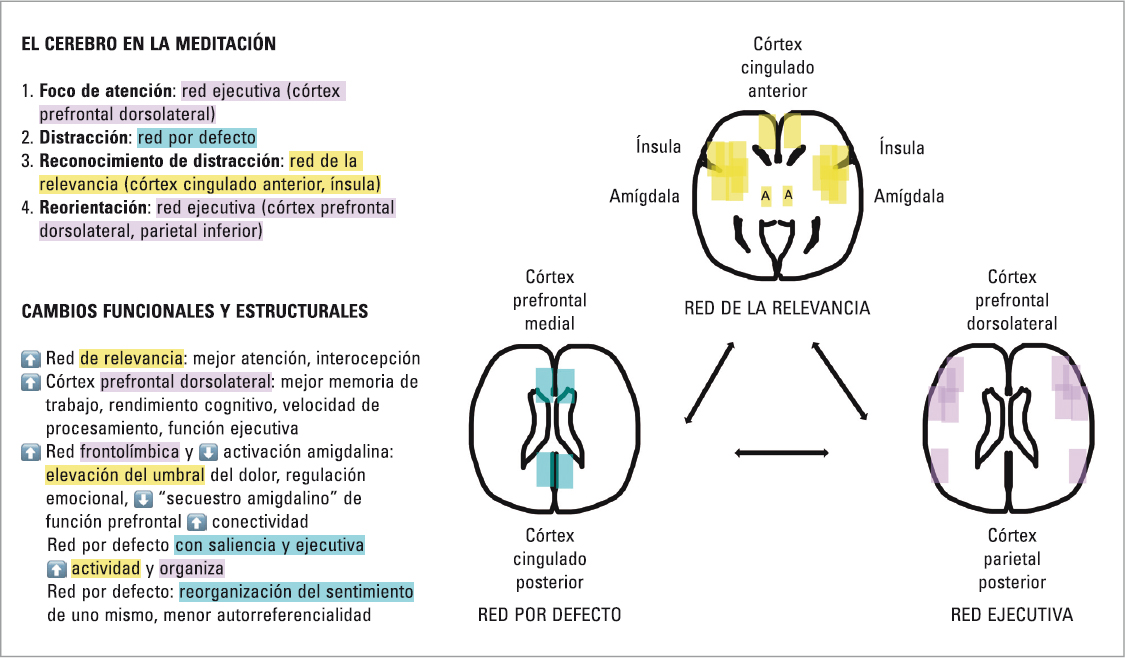 Esta capacidad de regular mejor la función de la red por defecto parece una de las claves de los beneficios de la meditación, y quizás más globalmente, de la contemplación32. A wandering mind is an unhappy mind, rezaba un trabajo ya clásico de Science que, al analizar de forma aleatoria los pensamientos y la sensación de felicidad en una amplia muestra de sujetos sanos, observó que casi la mitad del tiempo (30-50%) la mente se ocupaba en divagar, en lugar de estar enfocada en el presente, y que este acto se correlacionaba con sentimientos negativos (fenómeno conocido por el budismo como «mente de mono»)31,33. Si bien los procesos narrativos, pensamientos autogenerados de la red por defecto, no son necesariamente negativos (se incluyen la fantasía, el soñar de día, la imaginación, la resolución de problemas, etc.), una sobreactivación de esta red tiende a asociarse, por ejemplo, en estados depresivos, con rumiaciones de tinte negativo centradas en el pasado; en estados ansiosos, con anticipaciones angustiosas del futuro; y con el envejecimiento y en muchas enfermedades (depresión, Parkinson, trastornos neurológicos funcionales, fases tempranas de la demencia, otras) se observa una sobreactivación en reposo y una menor organización de estas estructuras32,34.